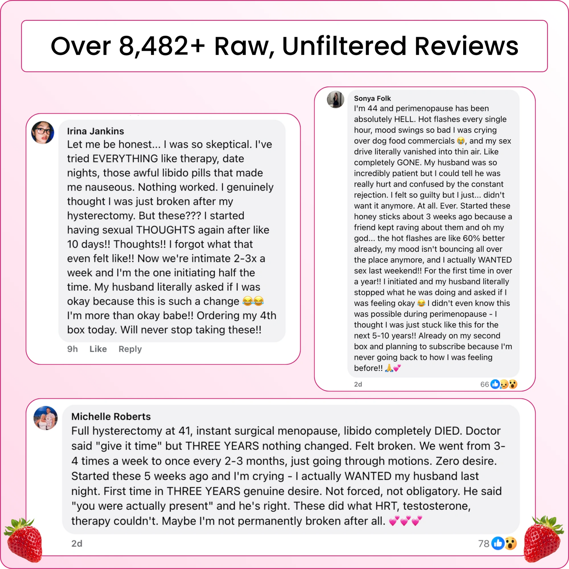 Prescription pills cause nausea, dizziness, and crashes without fixing the root problem. Lonira Honey Sticks replenish hormonal depletion naturally so desire returns without any side effects.